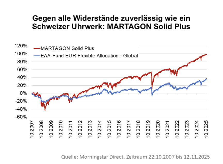 Seit Auflage steht der Martagon Solid Plus bei rund +100% Gesamtperformance, über fünf Jahre bei +31%, und das bei einer moderaten Volatilität von unter 7%. Für 2025 legte der Fonds bisher rund 6% zu. Damit erfüllt er genau sein Ziel: aktiennahe Renditen bei deutlich geringerem Risiko.