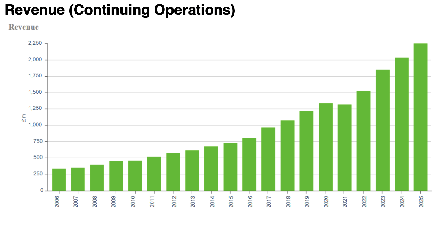 Revenue (Continuing Operations) ist der Umsatz der fortgeführten Aktivitäten von Halma, also das Kerngeschäft, das weiterhin Teil des Konzerns bleibt und über das alle weiteren Wachstums- und Profitabilitätsziele gesteuert werden.