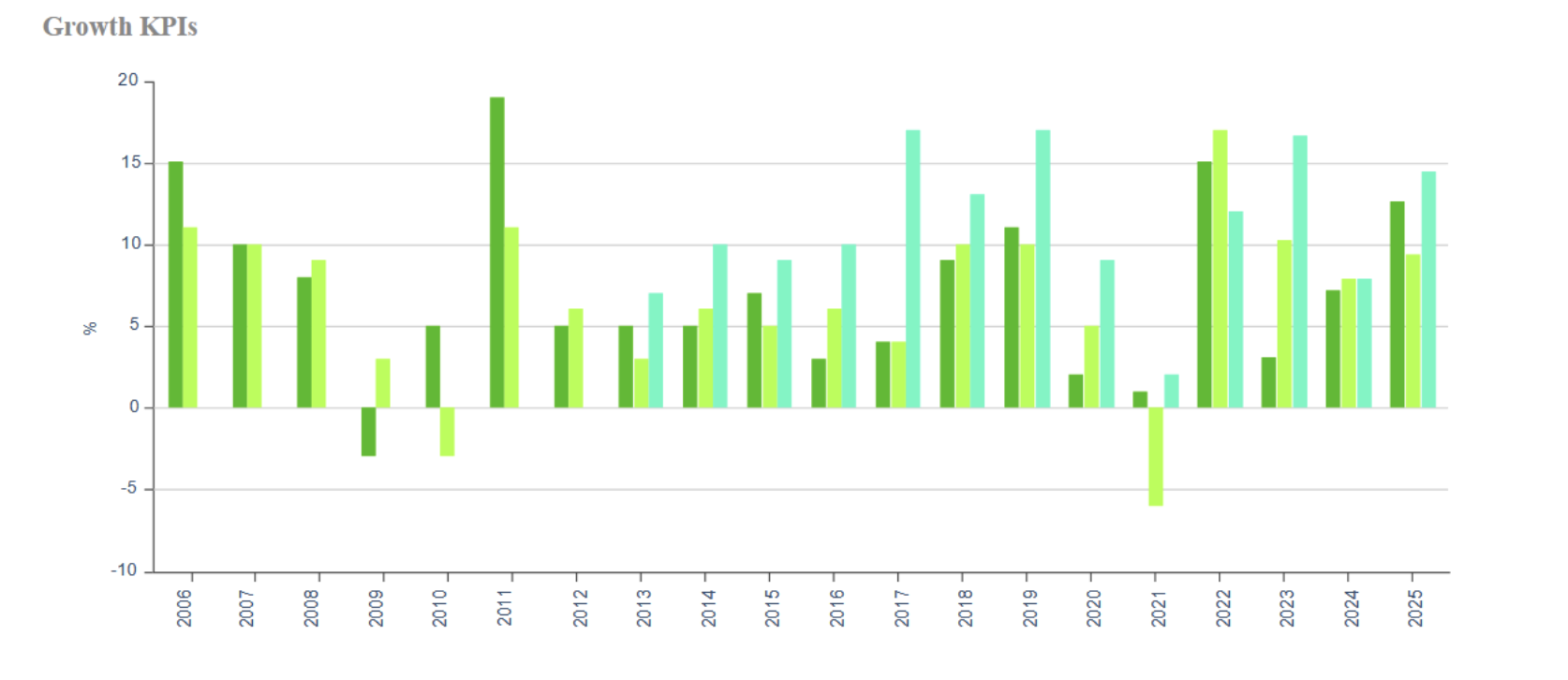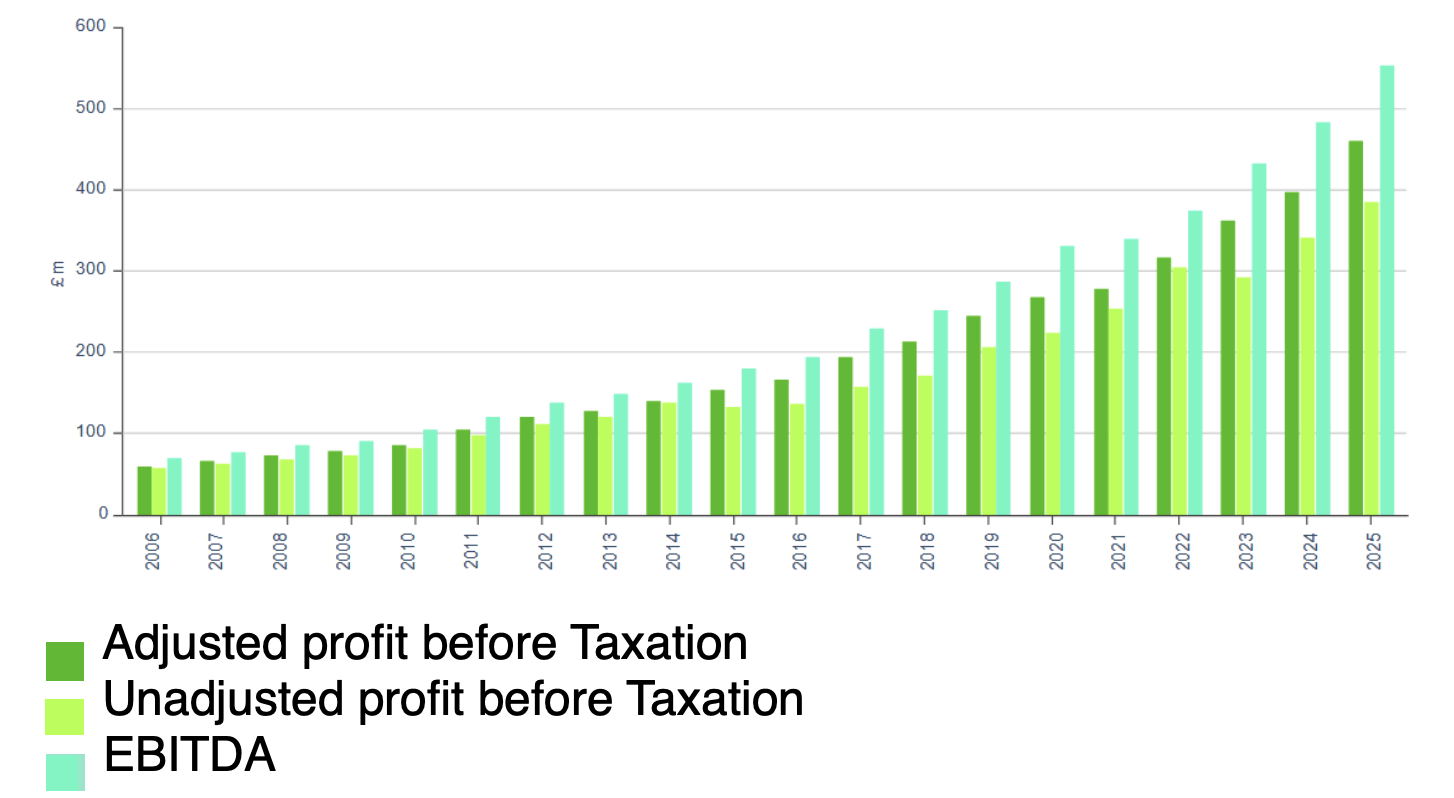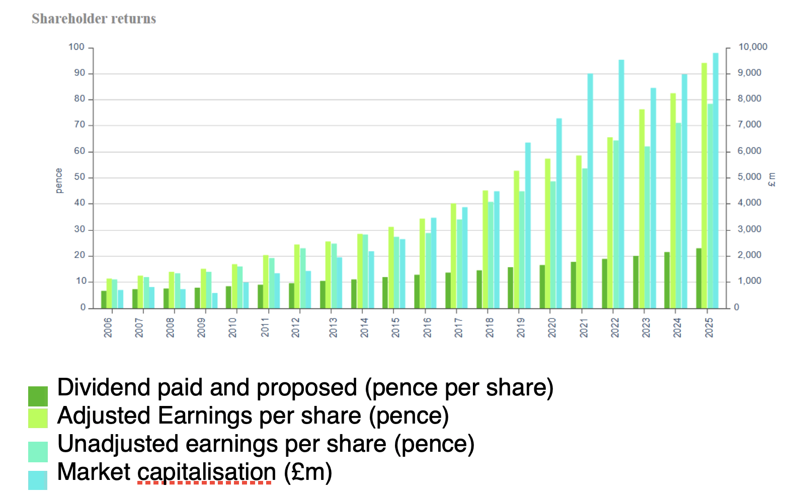 Halma strebt ≥ 5 % organisches Umsatz- und Gewinnwachstum an und kombiniert dies mit ≥ 10 % EPS-Wachstum, sodass sowohl das Kerngeschäft stark expandiert als auch für Aktionäre langfristig zweistellig steigende Gewinne pro Aktie erzielt werden.