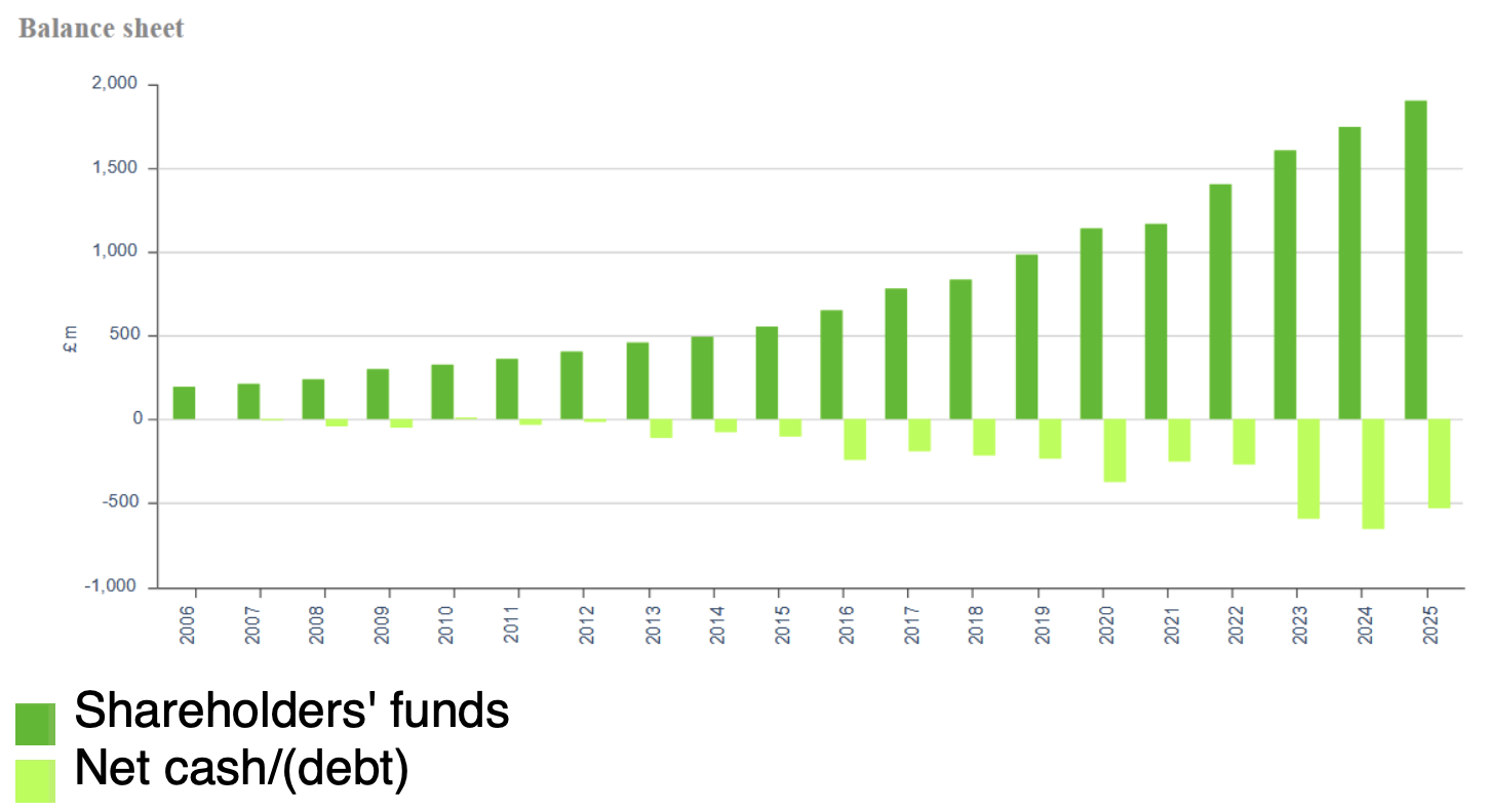 Net cash/(debt) = Nettoliquidität oder Nettoverschuldung und damit Maß für Halmas finanzielle Stärke und Spielraum für Wachstum.