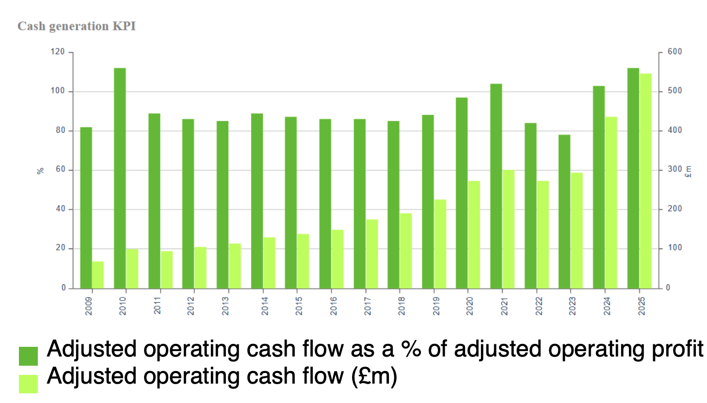 Halma strebt an, dass der bereinigte operative Cashflow mindestens 90 % des bereinigten operativen Gewinns erreicht – ein klarer Beleg für hohe Cashflow-Qualität. Der absolute Wert in £ m zeigt, wie viel davon tatsächlich als Liquidität für Dividenden, F&E und Akquisitionen zur Verfügung steht.