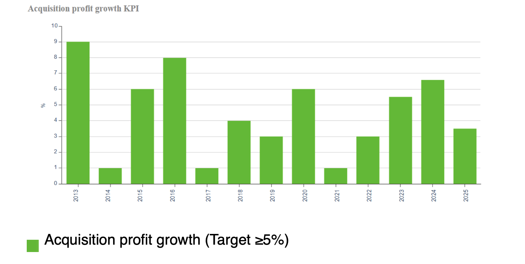 Das Acquisition Profit Growth KPI misst, wie stark Zukäufe das Gewinnwachstum treiben und soll langfristig etwa 5 % p. a. beitragen – eine der drei Wachstums-Säulen von Halma neben organischem Wachstum und Innovation/R&D.