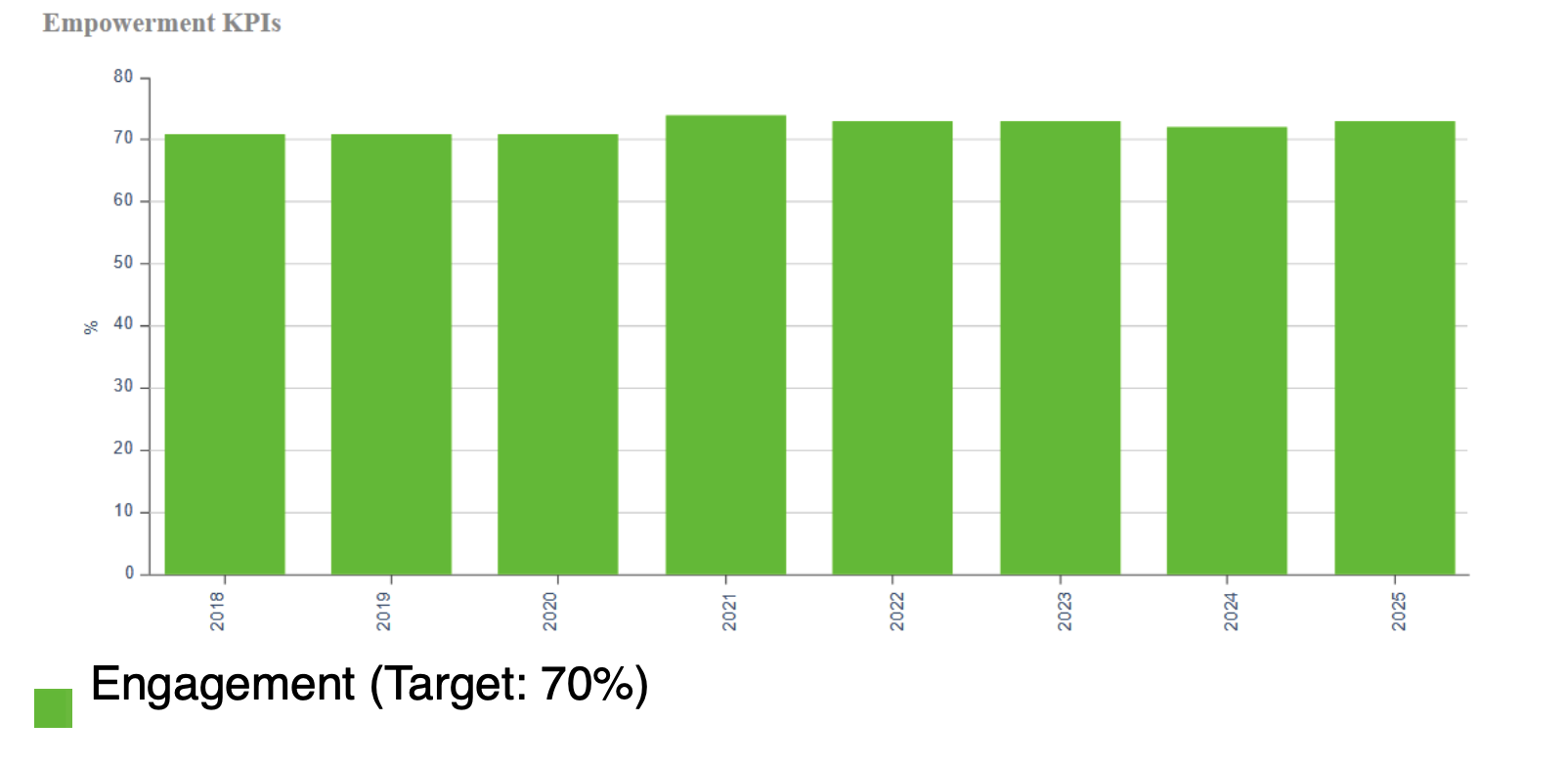 Das Engagement KPI misst, wie stark sich Halmas Mitarbeitende mit dem Unternehmen identifizieren und motiviert sind. Ziel ist ein Engagement-Score von mindestens 70 %, weil engagierte Teams die dezentrale Wachstumsstrategie und den nachhaltigen Erfolg direkt stützen.