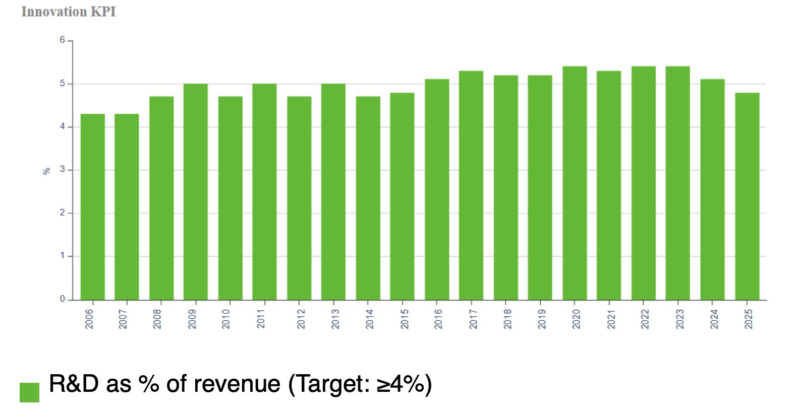 Das Innovation KPI misst nicht nur den Umsatzanteil neuer Produkte, sondern wird bei Halma explizit im Tandem mit der R&D-Quote geführt, um sicherzustellen, dass ausreichende F&E-Investitionen (≥4 % Umsatz) auch tatsächlich in marktfähige Innovationen (≥25 % Umsatz) übersetzt werden.