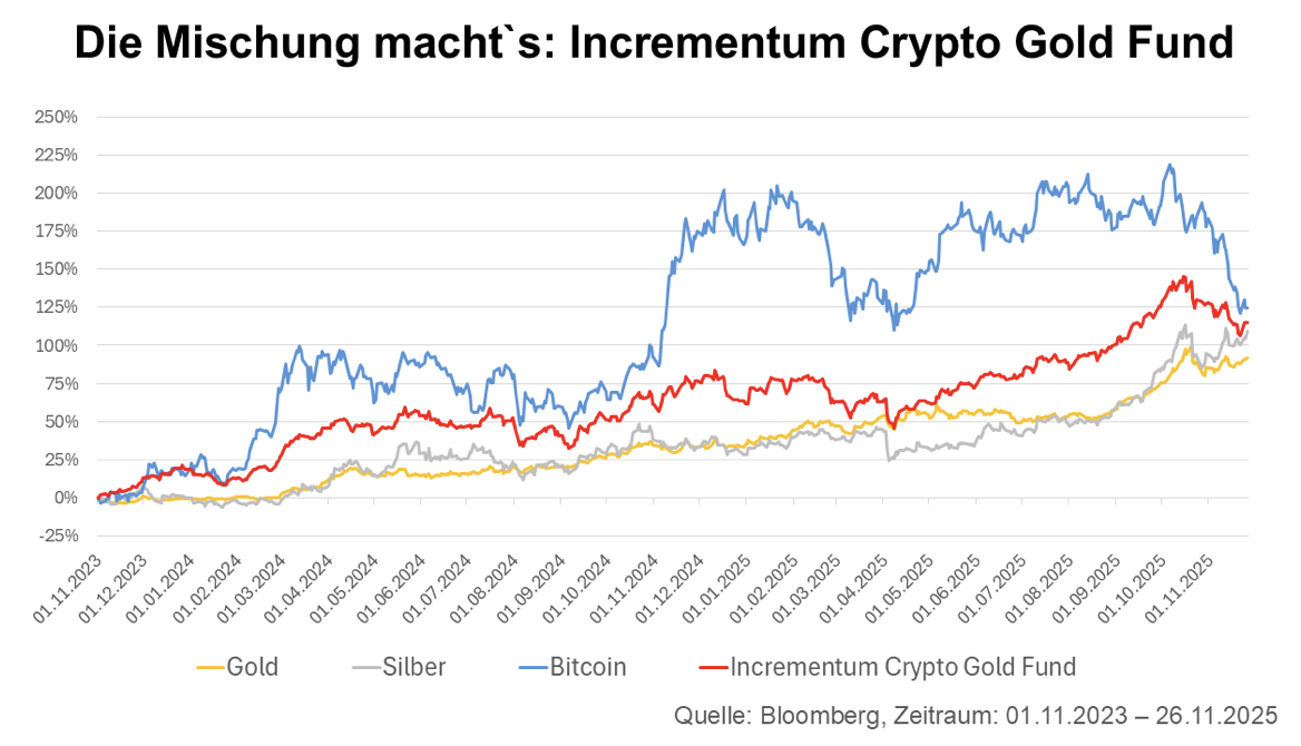 Genau dieses Konzept verfolgt der Incrementum Crypto Gold Fund EUR, den der österreichische Vermögensverwalter Incrementum 2021 aufgelegt hat. Ziel: die älteste Währung der Welt, ihr „kleines Geschwister“ Silber und das „digitale Gold“ Bitcoin in einem Fonds zu vereinen.