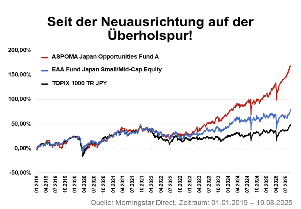 Dies wird durch die anhaltenden Corporate-Governance-Reformen und den zunehmenden Druck der Tokyo Stock Exchange auf die Unternehmen zur Verbesserung der Kapitaleffizienz unterstützt. Da insbesondere kleinere Titel eher geringer im Fokus der internationalen Analysten stehen, ist das Segment der japanischen Small- & Mid-Caps ein Eldorado für erfahrene aktive Manager. Ein solcher ist zweifelsohne die ASPOMA Asset Management GmbH mit Sitz im österreichischen Linz.