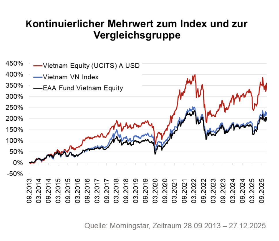 Die Zahlen des Fonds unterstreichen den Wachstumscharakter: Seit Auflage wurden überdurchschnittliche Renditen erzielt, bei erhöhter, aber bewusst eingegangener Volatilität, wie sie für chancenorientierte Strategien in aufstrebenden Märkten typisch ist. Per Ende 2025 liegt die Rendite bei rund 22% über ein Jahr, deutlich zweistellig pro Jahr über drei Jahre und im hohen einstelligen bis niedrigen zweistelligen Bereich auf längere Sicht. Das Portfolio umfasst knapp vier Dutzend Positionen mit klaren Schwerpunkten in Finanzdienstleistungen und Immobilien sowie weiteren wachstumsstarken Sektoren; Schwergewichte wie Vingroup, Vinhomes und Vietinbank zählen zu den größten Einzelpositionen.