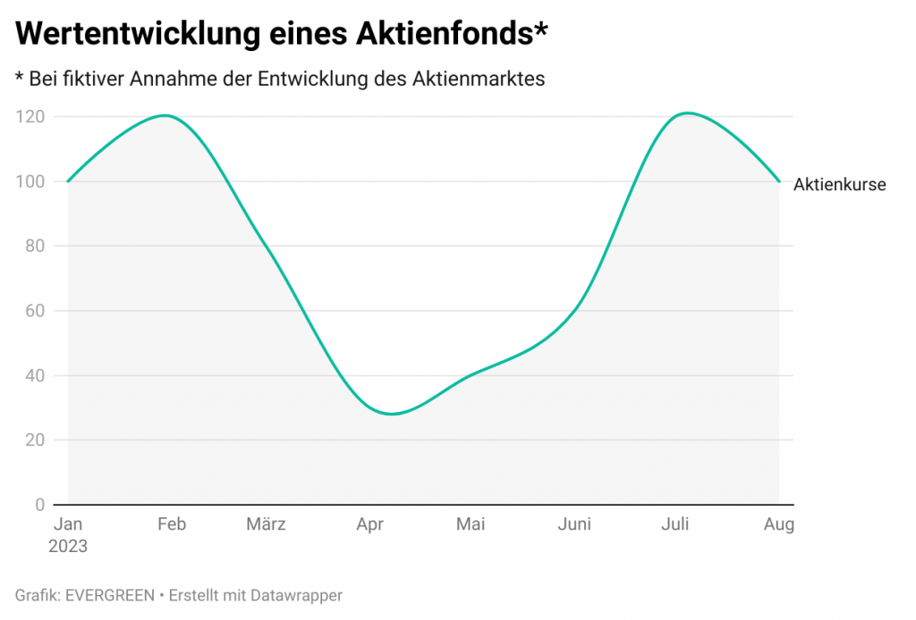 Anna und Peter investieren beide monatlich 1.000 Euro in einen Aktienfonds. Aufgrund einer Krise fällt dieser stark. Während Peter um den Tiefpunkt herum – zwischen April, Mai und Juni seine Sparrate aussetzt – investiert Anna kontinuierlich weiter. Peter steigt ab Juli wieder ein.